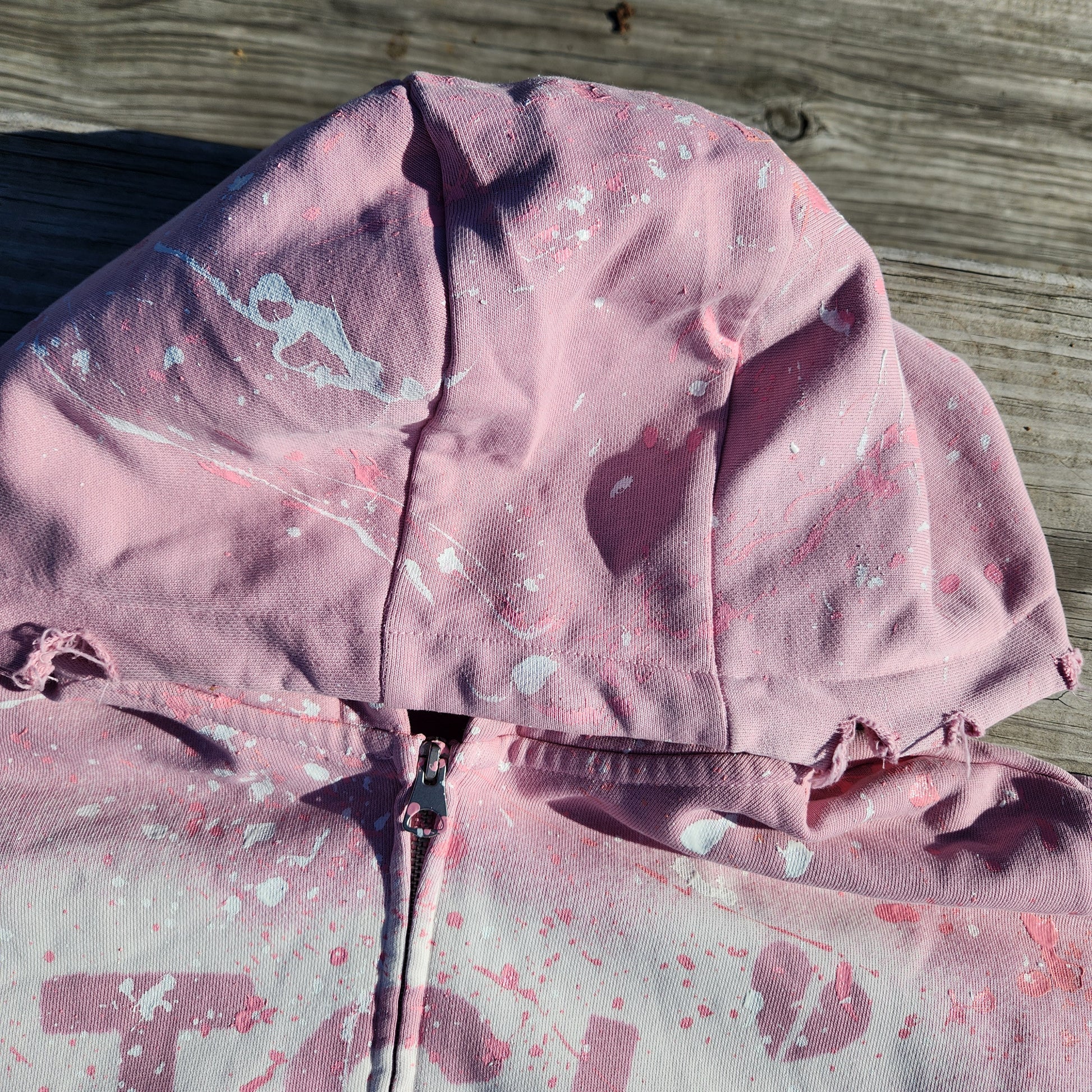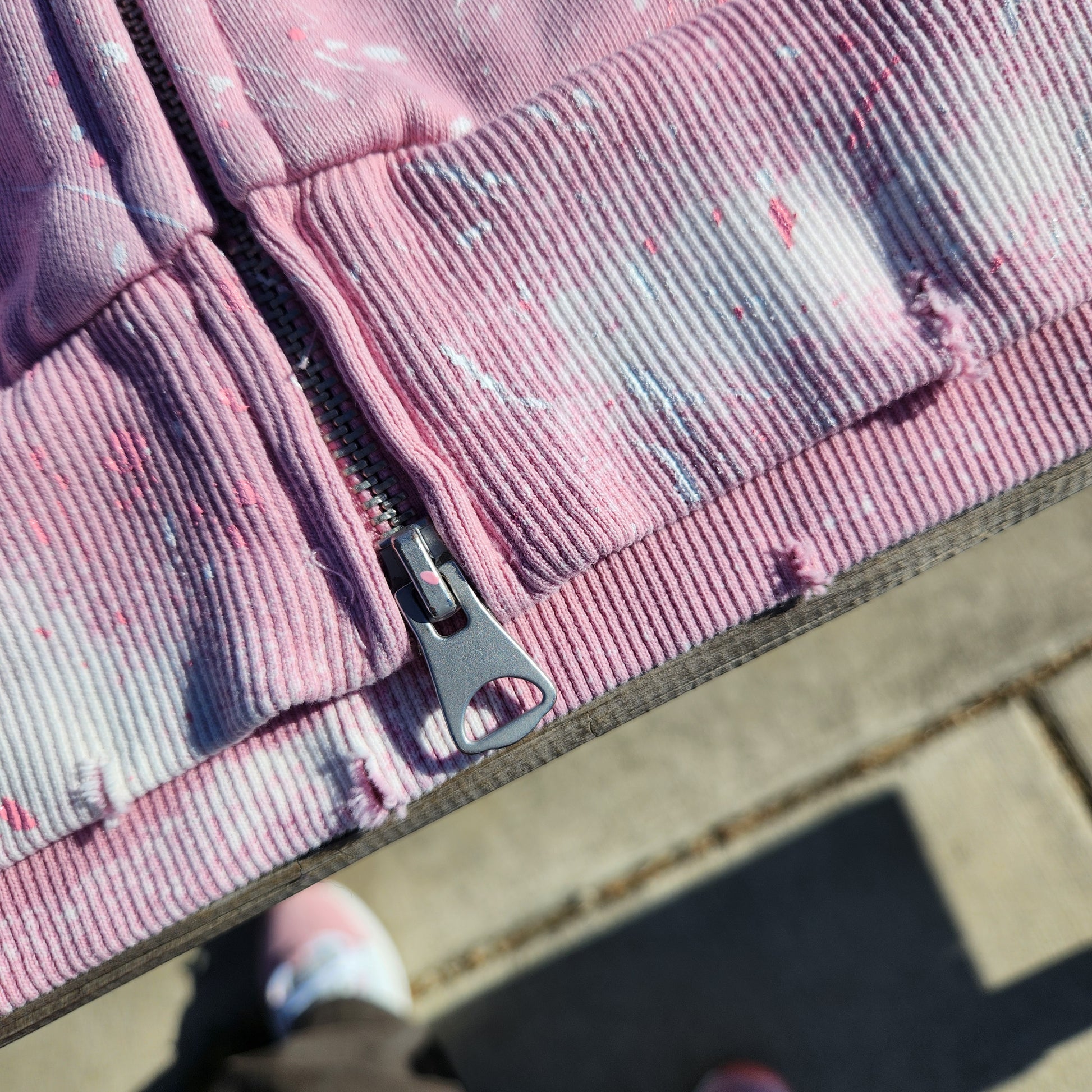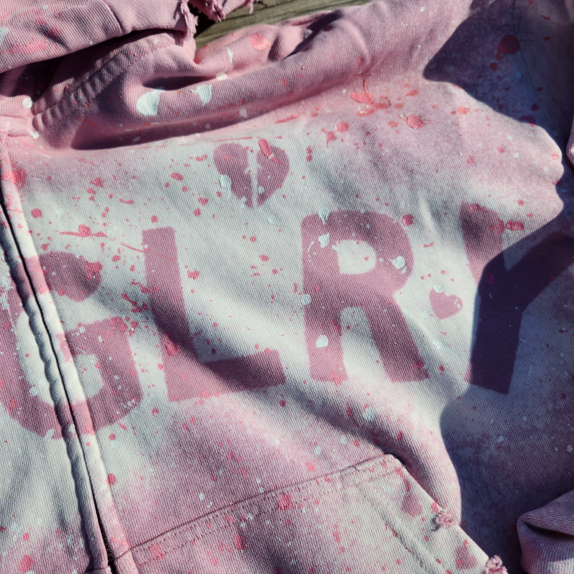 Bleached, disteessted, and hand paint splatter.